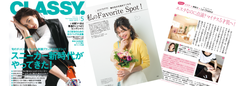 『CLASSY.』5月号に「私のお気に入りビューティスポット」としてラ シャルール が掲載されました。サロンで一番人気の『レチノール点滴システム』トリートメントをご紹介しております。